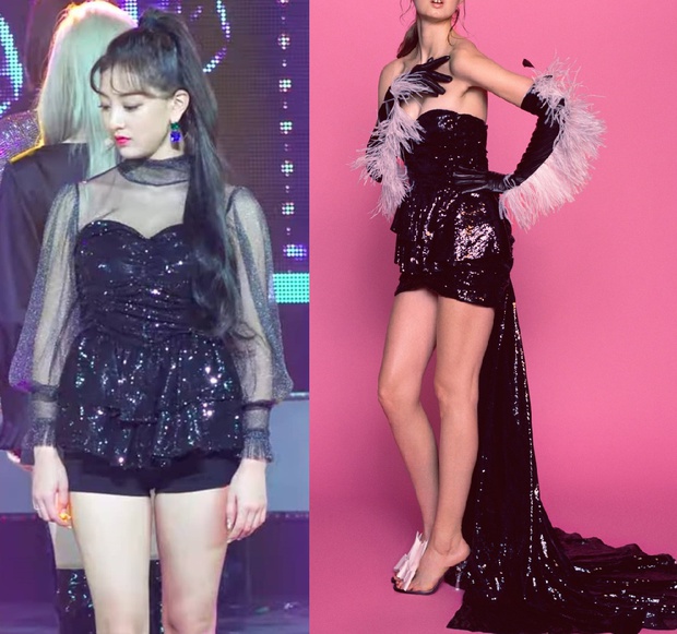 Đỉnh cao của những màn "đổ máu" với hàng hiệu có lẽ thuộc về TWICE. Để phục vụ việc chuẩn bị trang phục cho các nữ thần tượng, stylist của nhóm đã cắt tan nát chiếc váy quây gợi cảm của nhà mốt Attico có giá gần 50 triệu VNĐ và biến thành dáng áo ngắn cũn, sau đó mix thêm áo xuyên thấu lấp lánh bên trong để bộ đồ trông không khác gì bài tập về nhà môn thủ công dành cho học sinh